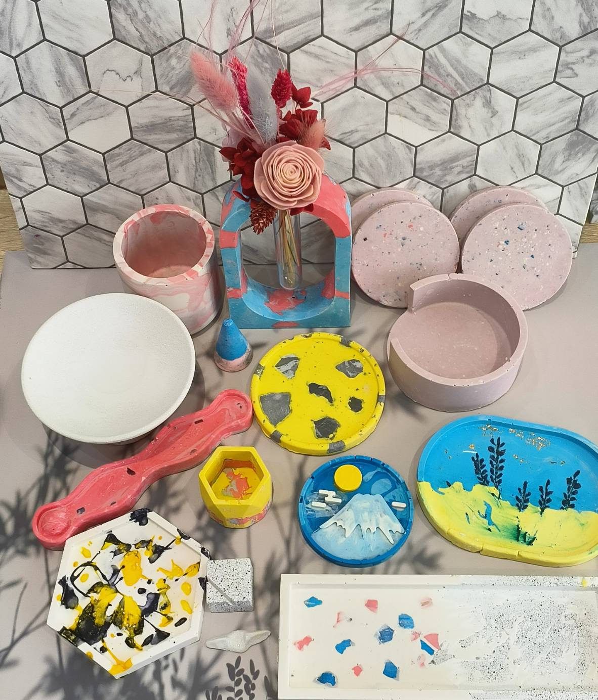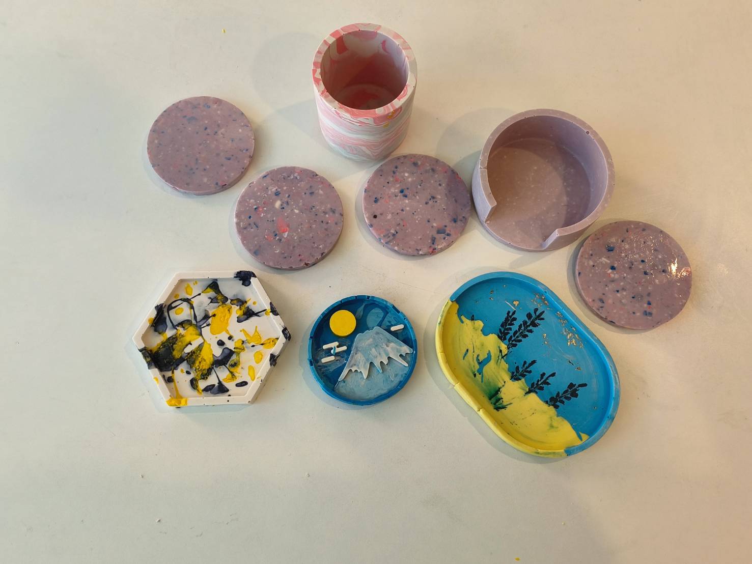 ❀環保樹脂作品運用環保樹酯搭配不同技法設計出渲染、潑墨、混搭方式的生活擺飾品,例如筆筒、置物盤、造型燭台、迷你托盤