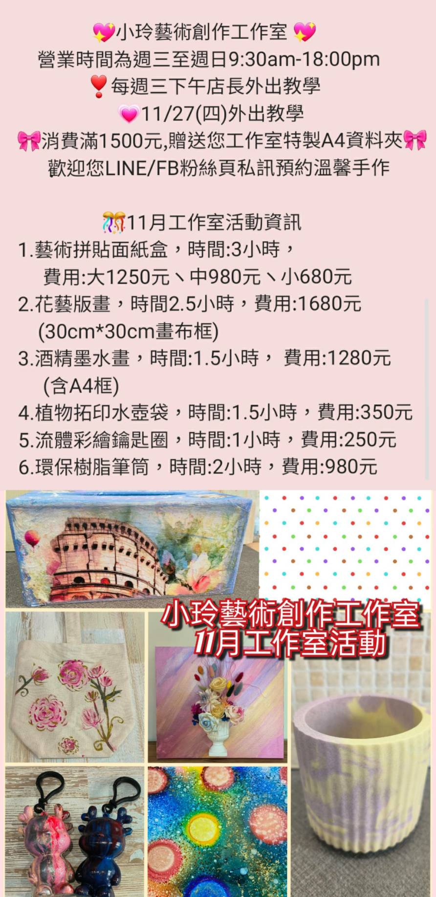 這是一家位於台南市中西區的藝術創作工作室,工作室的環境是安靜且放鬆的空間,適合紓壓的好地方。 店長在參加一個藝術拼貼生活小物的體驗課,漸漸發現自己的興趣,慢慢也接觸藝術拼貼、油畫/流體彩繪系列、浮游花系列、粉彩畫、擴香石變化設計,酒精墨水畫、晶漾花、花藝作品、花漾小物、韓國花禮果凍花藝燭台設計,希望送禮可以送到心坎裡,因為喜愛手作藝術小物,覺得手作的禮物是最有溫度,希望可以把這份溫暖傳送到每個需要的人!